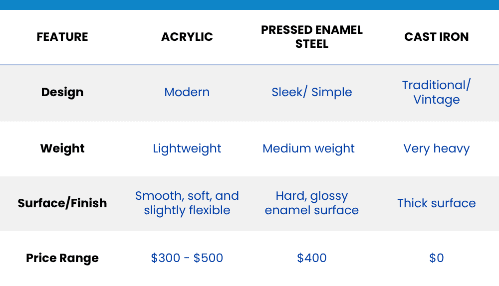 When choosing or identifying a bathtub, understanding the differences between materials can help inform your decision. Here’s a side-by-side comparison to help you distinguish the differences between the three tub types.